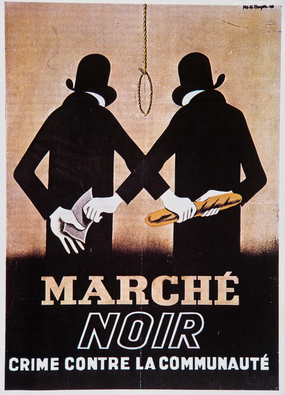 La vie est différente en France suivant la zone dans laquelle on vit jusqu’à la fin de l’année 1942. En zone occupée, la présence allemande modifie l’ambiance des villes qui se couvrent de panneaux en allemand et de drapeaux nazis,tandis que l’horaire des Français est aligné sur le méridien qui passe à Berlin. Le couvre-feu restreint les sorties du soir et le dernier métro passe à minuit moins le quart. En revanche, l’obsession commune à tous les Français, c’est la faim et le froid. En effet, le pillage allemand provoque de fortes restrictions et l’absence des Français retenus comme prisonniers de guerre en Allemagne désorganise considérablement la production économique. Les cartes de rationnement sont instaurées à partir de l’automne 1940 suivant un système qui fournit de1 200 à 1 800 calories par jour et par personne,selon l’âge, les activités et le lieu de résidence : huit catégories ont été fixées. À Paris,avec ses tickets de rationnement,un adulte peut acheter 275 grammes de pain par jour. Par semaine, il peut acquérir 350 grammes de viande avec os, 100 grammes de matières grasses et 70 grammes de fromage. Par mois, ses tickets lui donnent droit à 200 grammes de riz, 500 grammes de sucre et 250 grammes de pâtes. Tout ceci à condition que les produits ne manquent pas. Les Français élèvent des lapins et des poules, accommodent les rutabagas et les topinambours comme ils le peuvent, et sont attentifs à ramasser le moindre mégot. Les bas étant devenus introuvables, les femmes se peignent les jambes,poussant le réalisme jusqu’à dessiner la couture du bas. Par manque d’essence – réquisitionnée pour les véhicules allemands –, les voitures fonctionnent au charbon de bois grâce au gazogène, un appareil simple à fabriquer, avec des matériaux faciles à se procurer, et qui produit un gaz pauvre permettant d’alimenter les moteurs. Les semelles de bois ou de liège remplacent le cuir. Tout est soumis au rationnement, le tabac, la laine... Les Français souffrent de la faim, de la malnutrition et tombent plus facilement malades: le nombre de morts dues à la tuberculose double.Les carences alimentaires ou en vitamines que subissent les enfants affectent leur croissance. Les queues s’allongent quotidiennement devant les magasins et les épiciers, dont les boutiques sont vides mais les arrière-boutiques souvent pleines, en profitent. Pour s’en sortir, les Français pratiquent le marché noir, strictement interdit :dans les rapports de gendarmerie, ce délit figure dans la rubrique « Agissements nuisibles au relèvement du pays ». Les Français qui s’y livrent achètent au prix fort, sans ticket de rationnement, les aliments qui manquent le plus comme le beurre, le café, les fruits ou la viande. Mais tous n’ont pas les moyens nécessaires pour profiter de ce trafic, d’autant que les prix ont connu une hausse considérable. Ainsi, le kilo d’épinards qui était à 2,50 francs en 1940 s’élève à 10 francs l’année suivante dans la ville de Tours. Les allers et retours sont alors fréquents pour trouver du ravitaillement dans les familles qui vivent à la campagne. En effet, si les villes souffrent de la faim, les campagnes, elles, ont accès à une alimentation suffisante et variée. De plus, d’un département à l’autre, les produits circulent mal. La ration quotidienne moyenne est alors estimée à 1 500 calories, et assurément moins en ville. À titre de comparaison, un rapport de l’OCDE daté de 2005 estime la consommation actuelle moyenne en France à 3 654 calories. Pendant la guerre, les Français souffrent également du froid, d’autant que les hivers sont rigoureux, surtout en 1940-1941.